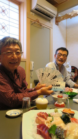 「寿司魚正」さんのお食事券を持っての笑顔です。